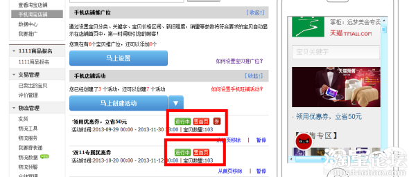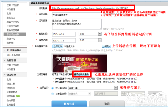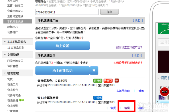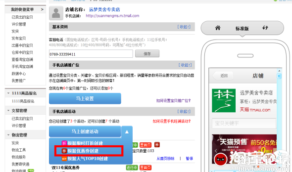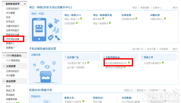 第三步:点击PC店铺后台左侧导航中的【手机淘宝店铺】,再点击【店铺设置】里面的【设置店铺营销活动】