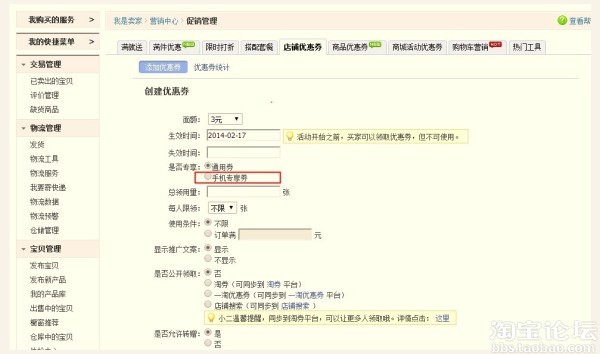 如下图可知,进入:我是卖家>营销中心>促销管理,点击【店铺优惠券】,便可看到【创建优惠券】里面有一项【是否专享】,大家点击【手机专享劵】便可完成设置!