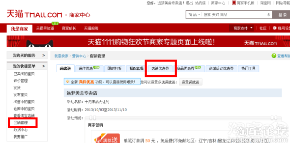 登陆我们PC店铺后台创建,如下图点击【促销管理】——>【店铺优惠劵】,进入优惠劵设置